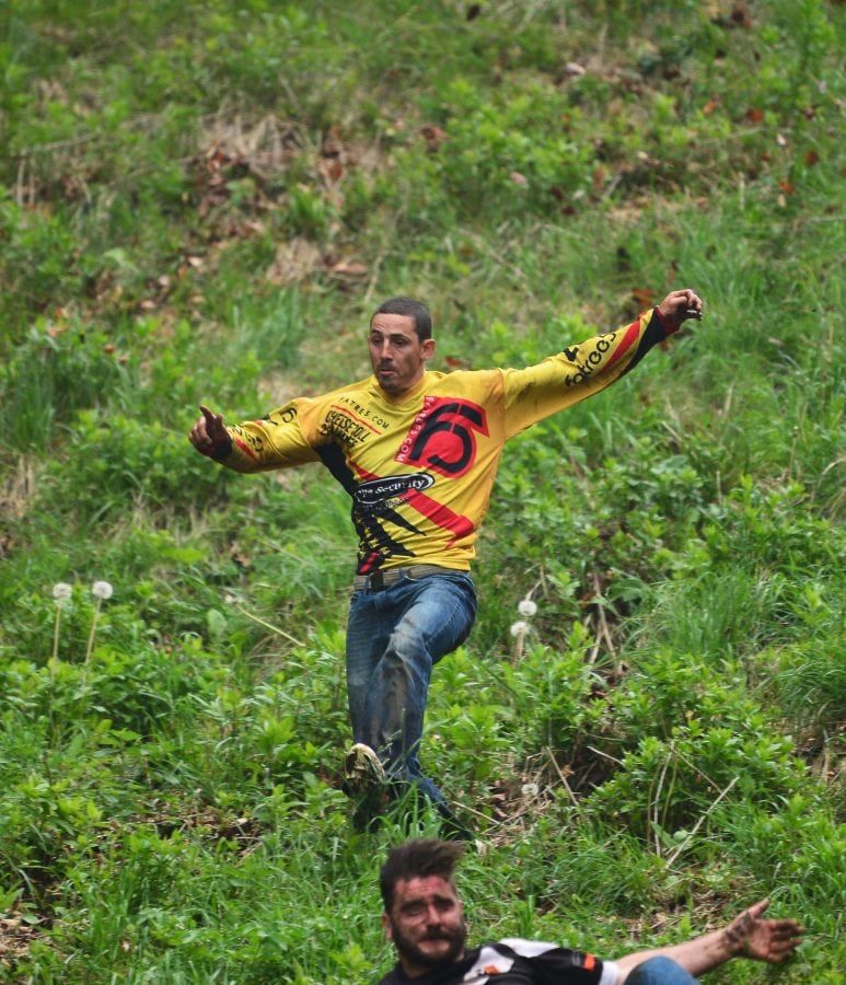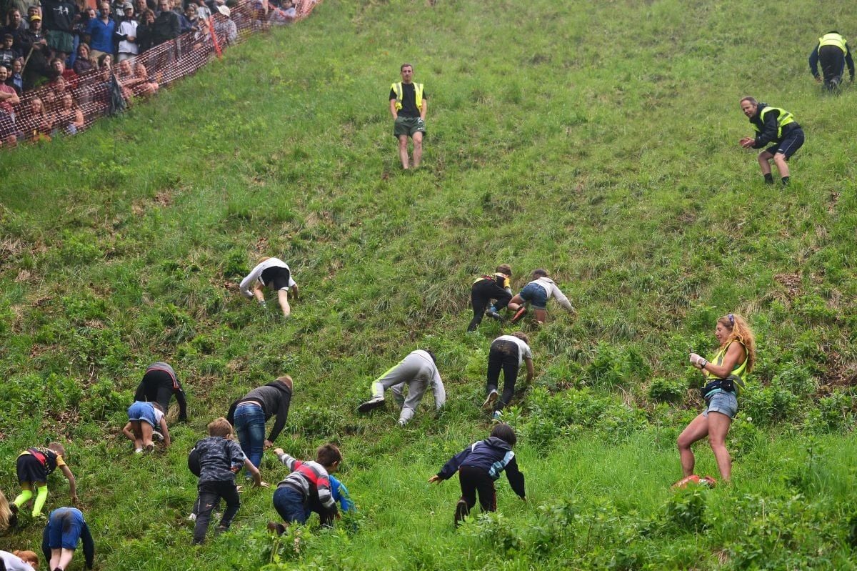Thousands gathered to watch one of Britain’s wackiest sporting events, where runners sprint (and tumble) after a heavy cheese that goes hurtling down a steep hill at break-neck speeds.