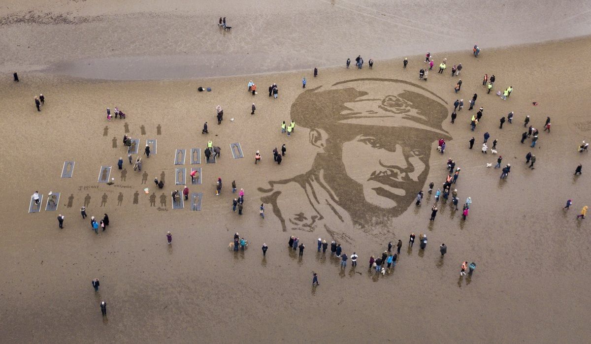 Beautiful sand drawing on Ayr Beach in Scotland of Second Lieutenant Walter Tull who was also Britain's second black professional footballer