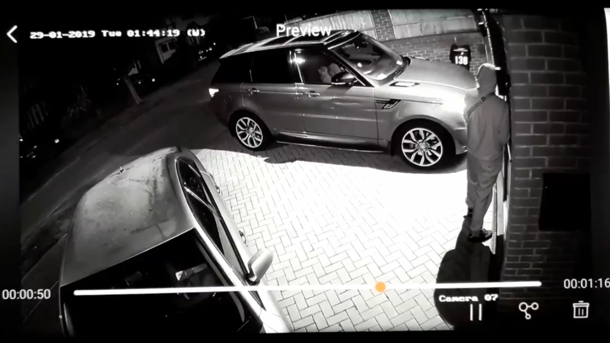 CCTV shows a thief unlocking the doors to a Range Rover Sport on a driveway by simply standing next to the front door nearby.